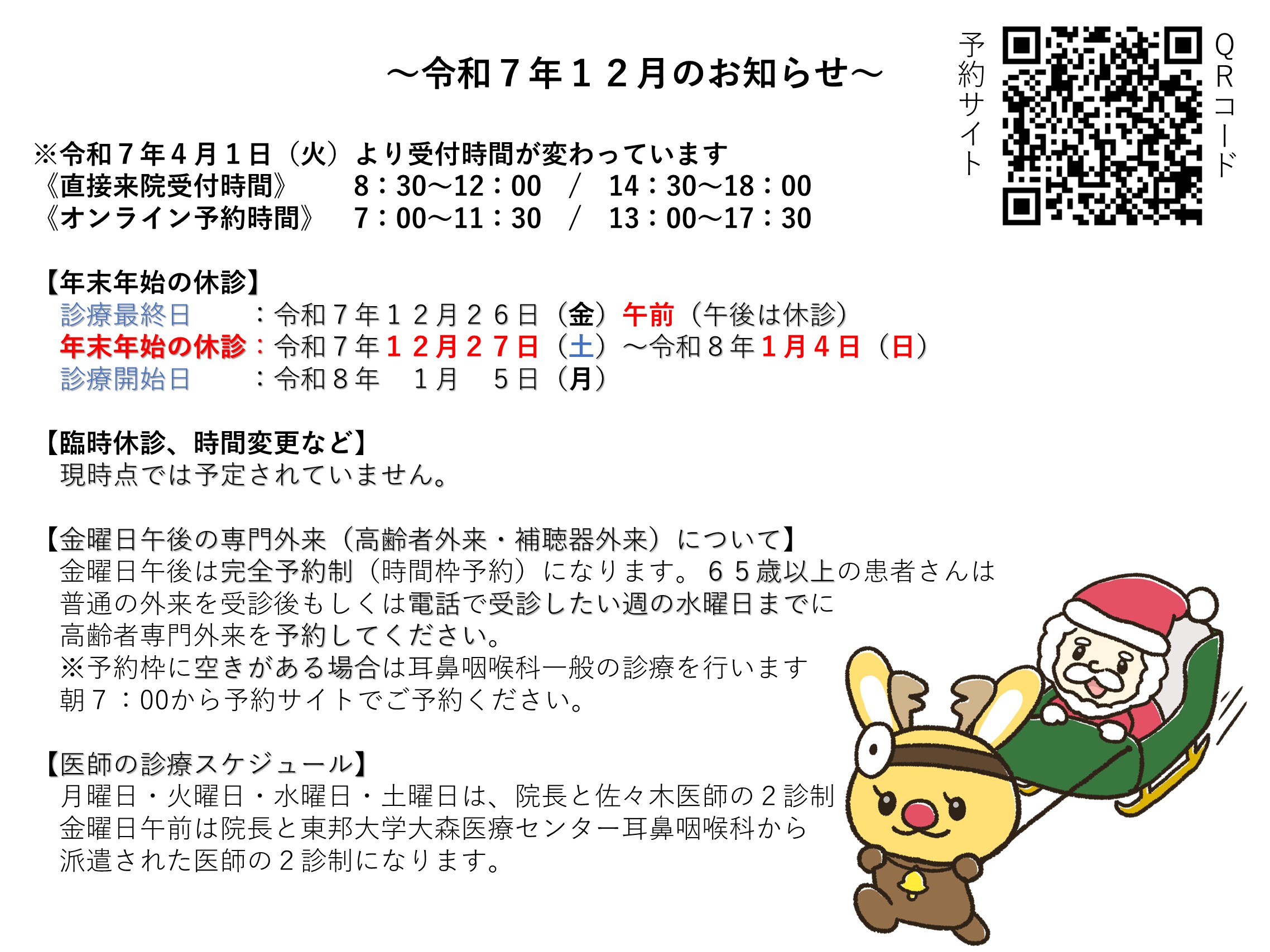 令和7年11月2日(日)は川崎市耳鼻咽喉科休日当番で休日診療を行っています。